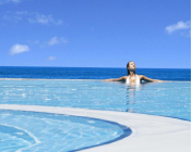 The 5-star Charisma Hotel offers a 60-metre private beach and an infinity pool with panoramic views of the Aegean Sea.
